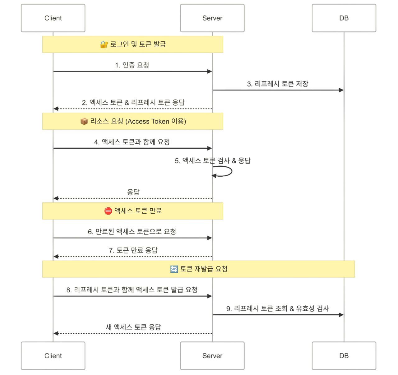- 서버는 JWT 검증 후, 사용자 권한 확인 및 리소스 제공